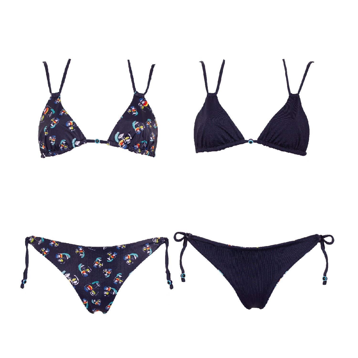 Ce maillot de bain triangle et sa culotte légèrement échancrée tirent leur originalité dans les couleurs pétillantes choisies ainsi que par les perles qui rappellent l’œil qui est souvent dessiné par l’artiste. Le maillot de bain est entièrement réversible, pour choisir le côté imprimé ou uni selon votre préférence, vous permettant d’avoir plusieurs combinaisons possibles avec un seul maillot de bain. Ajustable par les ficelles, il s'ajuste parfaitement pour un confort optimal.