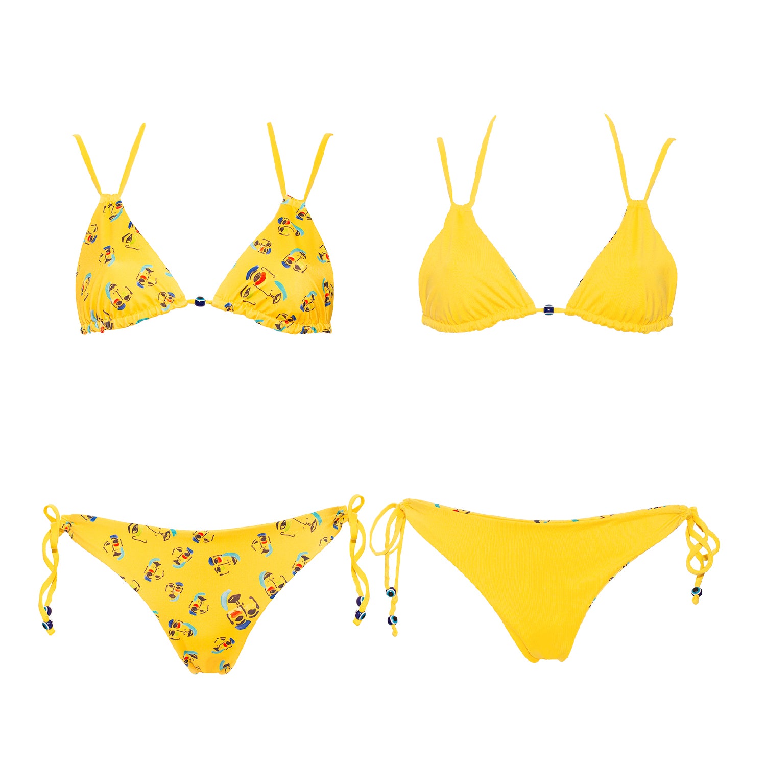 Ce maillot de bain triangle et sa culotte légèrement échancrée tirent leur originalité dans les couleurs pétillantes choisies ainsi que par les perles qui rappellent l’œil qui est souvent dessiné par l’artiste. Le maillot de bain est entièrement réversible, pour choisir le côté imprimé ou uni selon votre préférence, vous permettant d’avoir plusieurs combinaisons possibles avec un seul maillot de bain. Ajustable par les ficelles, il s'ajuste parfaitement pour un confort optimal. |