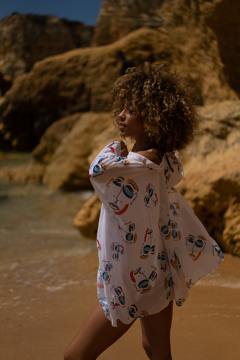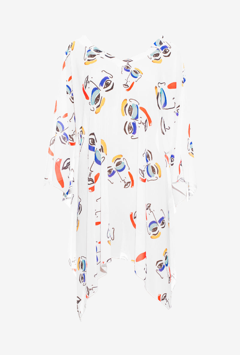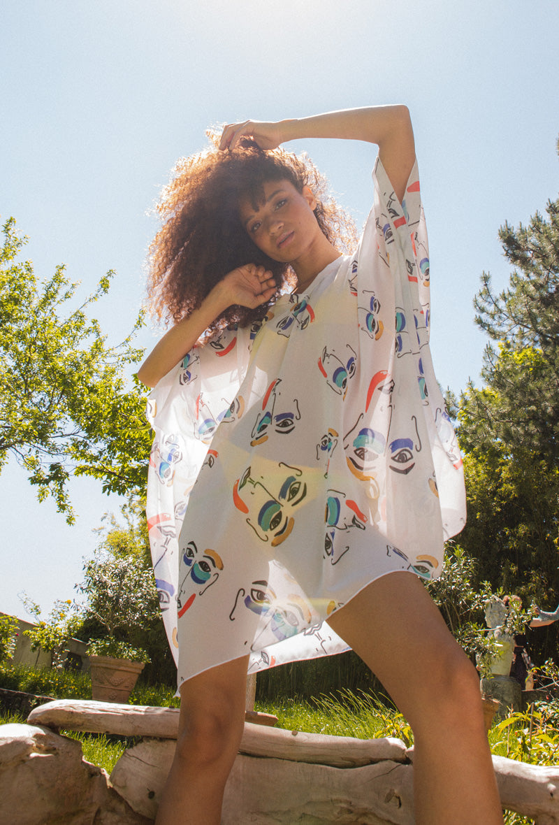 This extremely light and fluid kaftan is an accessory full of visual story-telling and creativity. The colorful designs will add some dynamics to your summer wardrobe. Its ample sleeves and the slightly asymmetrical hemline make this piece original and fun to wear!