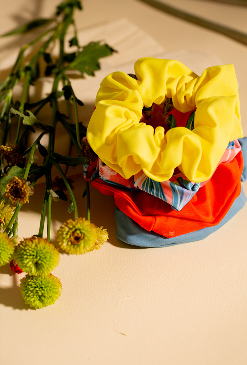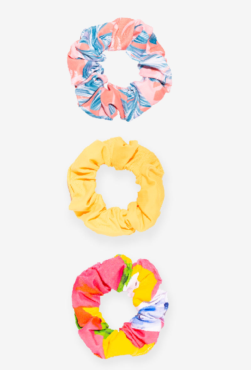 Surprise bag! To accessorize your summer ensemble, choose an assembly of 3 colorful scrunchies. To take action against waste, we are harvesting offcuts from swimwear production to create more than 50 original and colourful scrunchie designs.