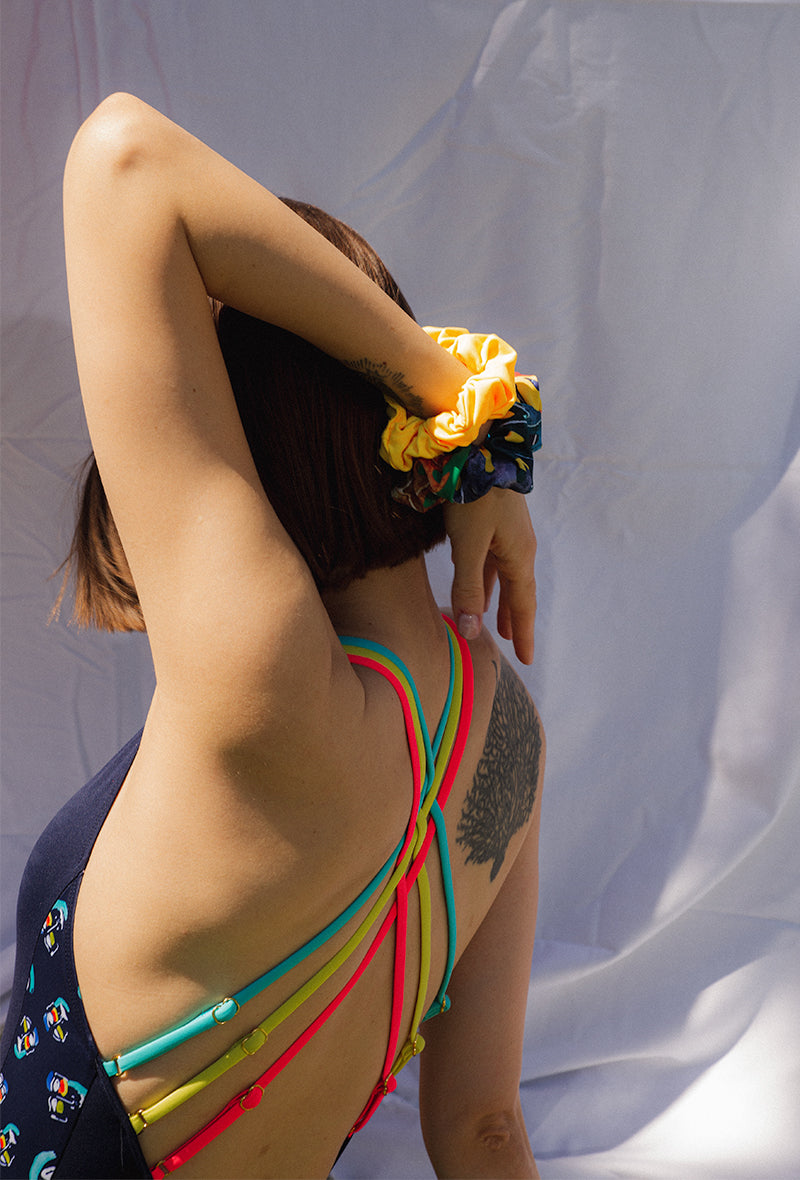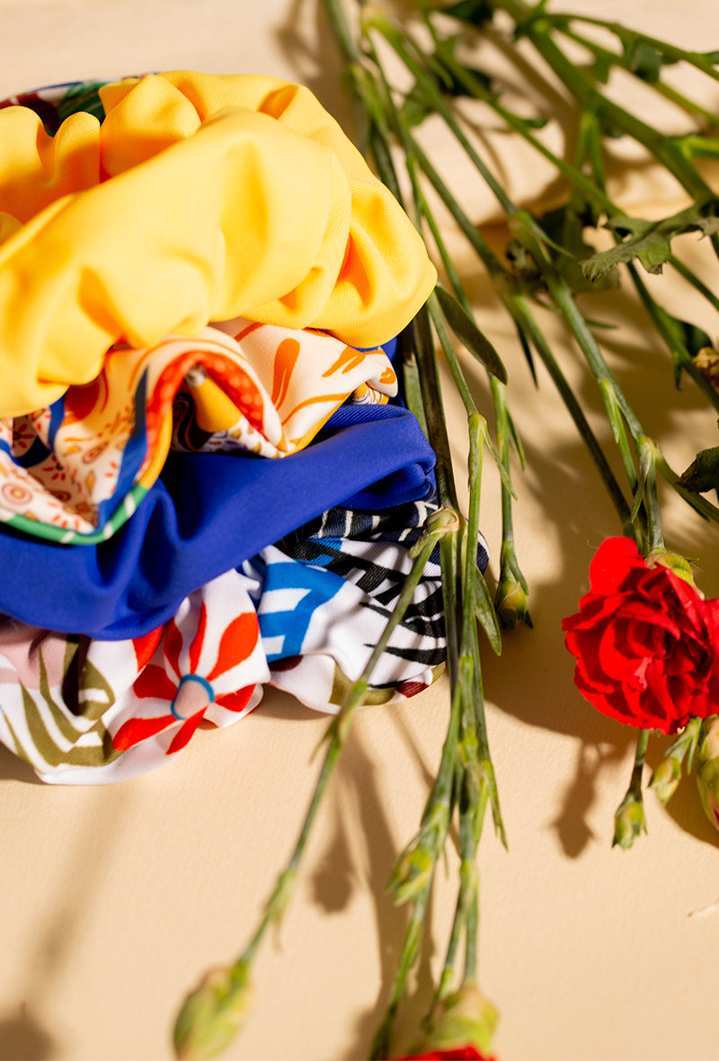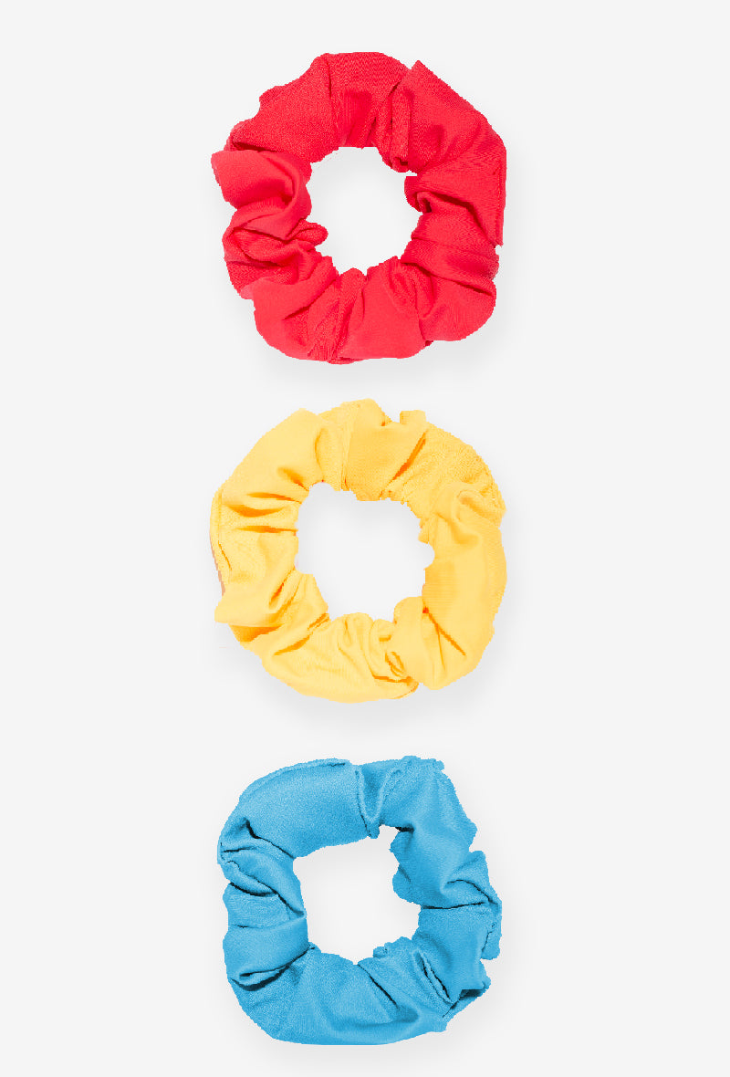 Surprise pouch! To accessorise your summer outfit, choose an assembly of 3 colourful scrunchies. To act against waste, we collect the off-cuts from the production of swimwear to create more than 50 models of original and colourful scrunchies.