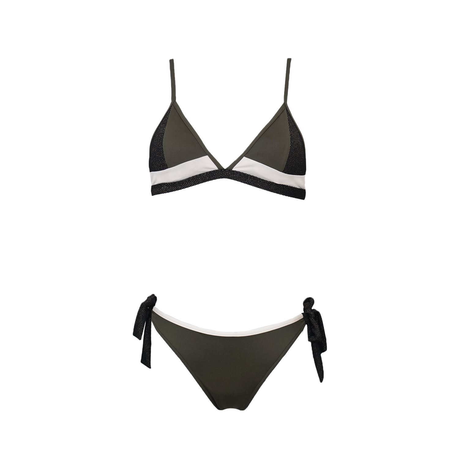 Ce maillot de bain au design patchwork saura vous séduire. Le haut de bikini est un triangle classique.