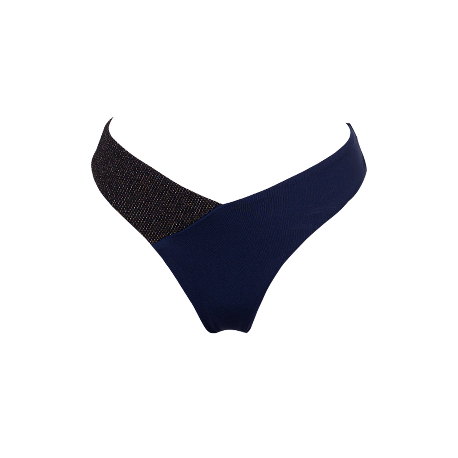 Ce bas à la coupe tanga est lui aussi asymétrique en mélangeant un bleu marine uni ainsi que du tissu à fil doré, faisant écho à la fine bande dorée sous le haut triangle. Son style asymétrique reflètera les différentes parties de votre personnalité.