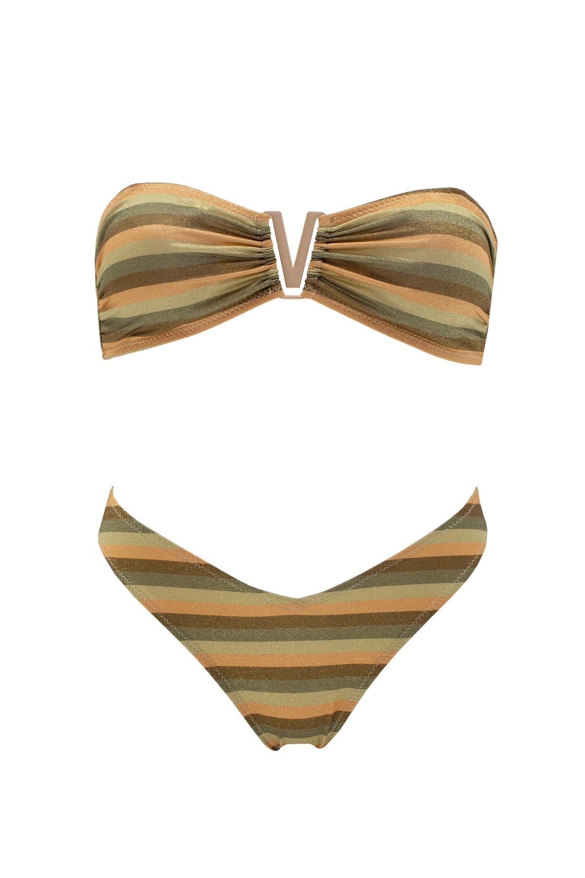 Maillot de bain deux pièces en tissu lurex pailleté, doté de rayures colorées d'inspiration vintage. Son haut bandeau est accompagné de bretelles amovibles, et un accessoire en forme de V orne le milieu de la poitrine. Le bas présente une coupe tanga pour une allure résolument tendance. Un mélange parfait d'éclat, de style rétro et de glamour.