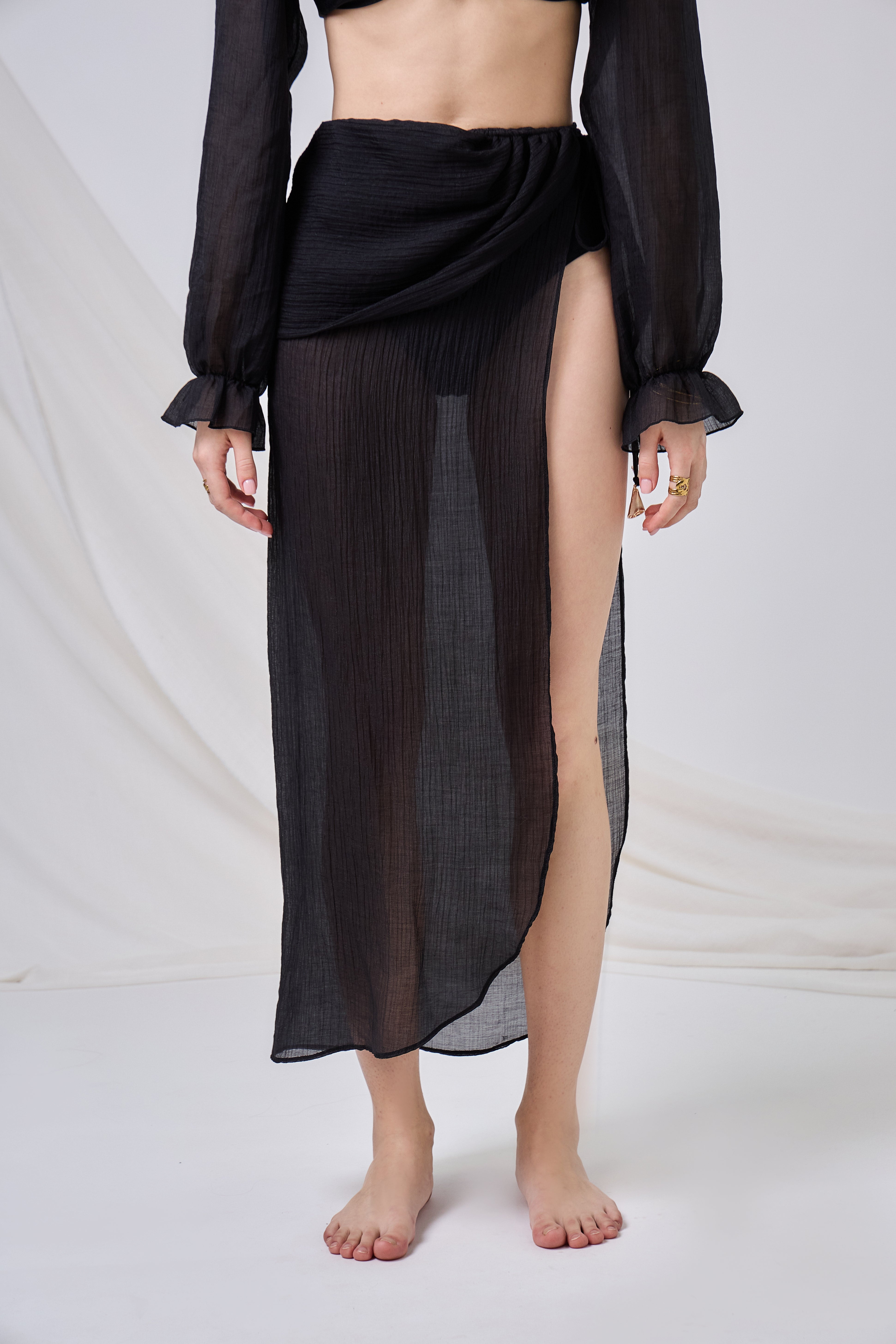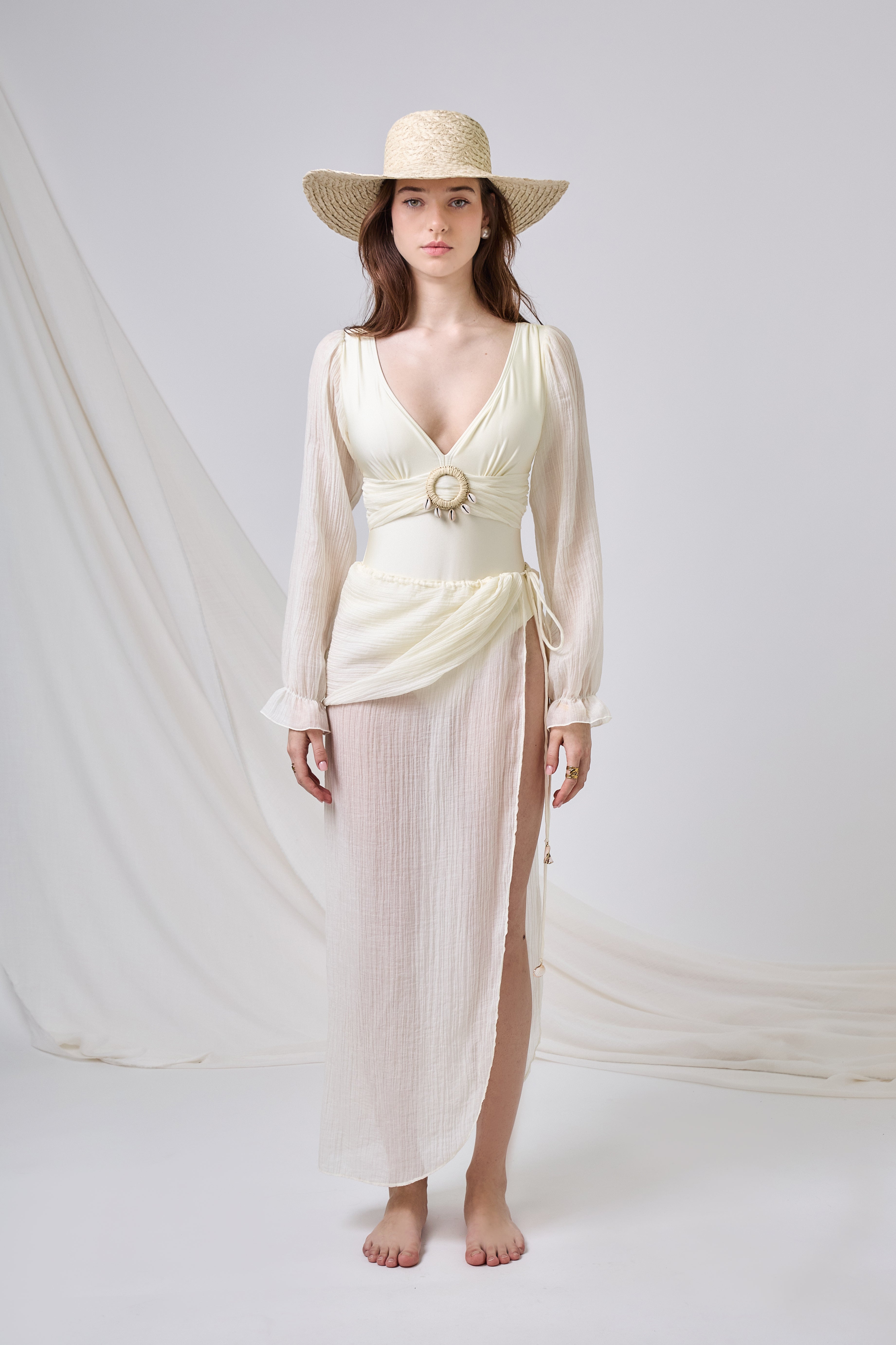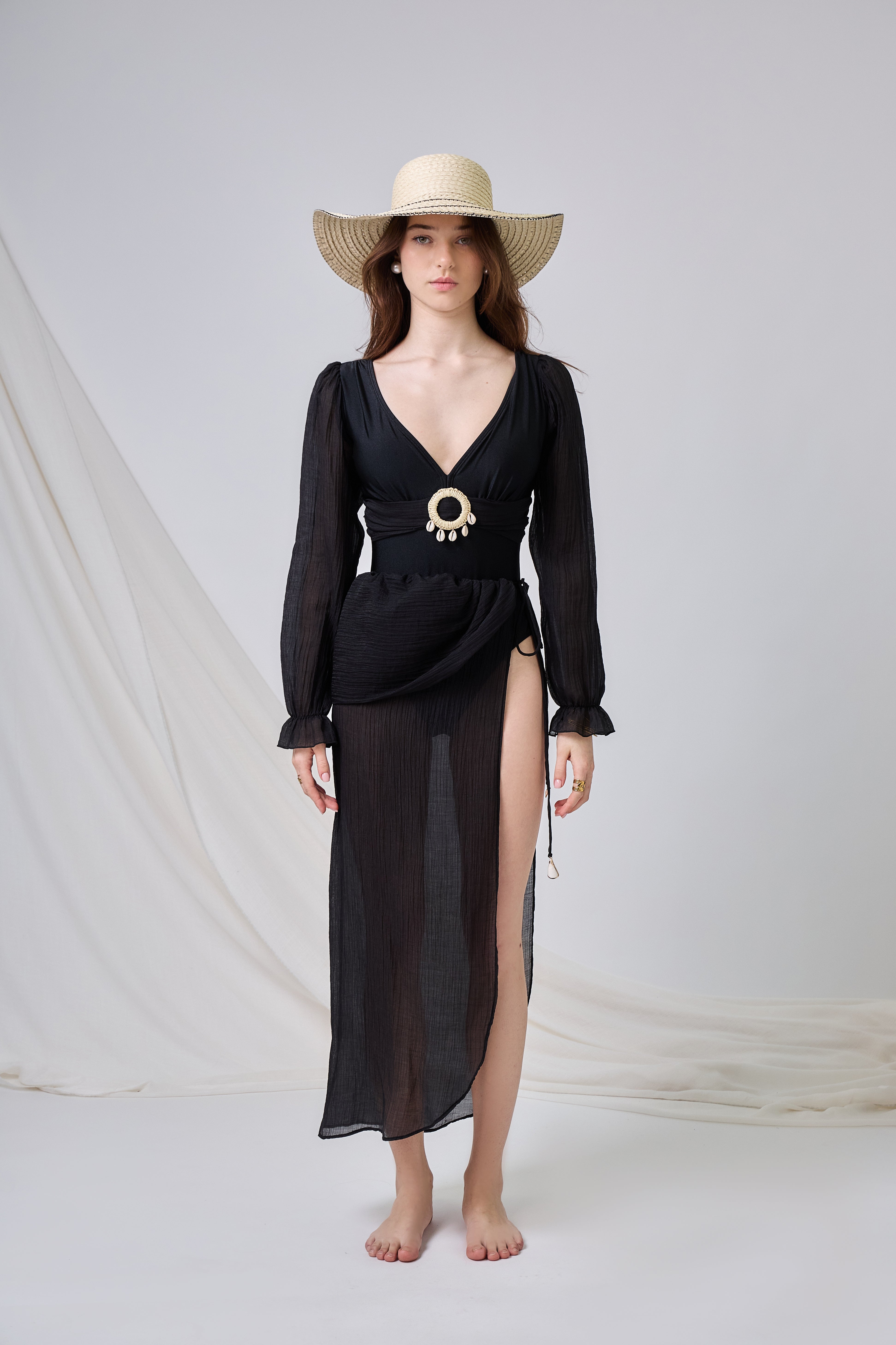 Léger comme l’écume et doux comme une brise d’été, The Siren’s Veil est un paréo vaporeux qui épouse naturellement les mouvements du corps. Son drapé délicat se noue à la taille et peut se porter de plusieurs façons, selon l’envie.