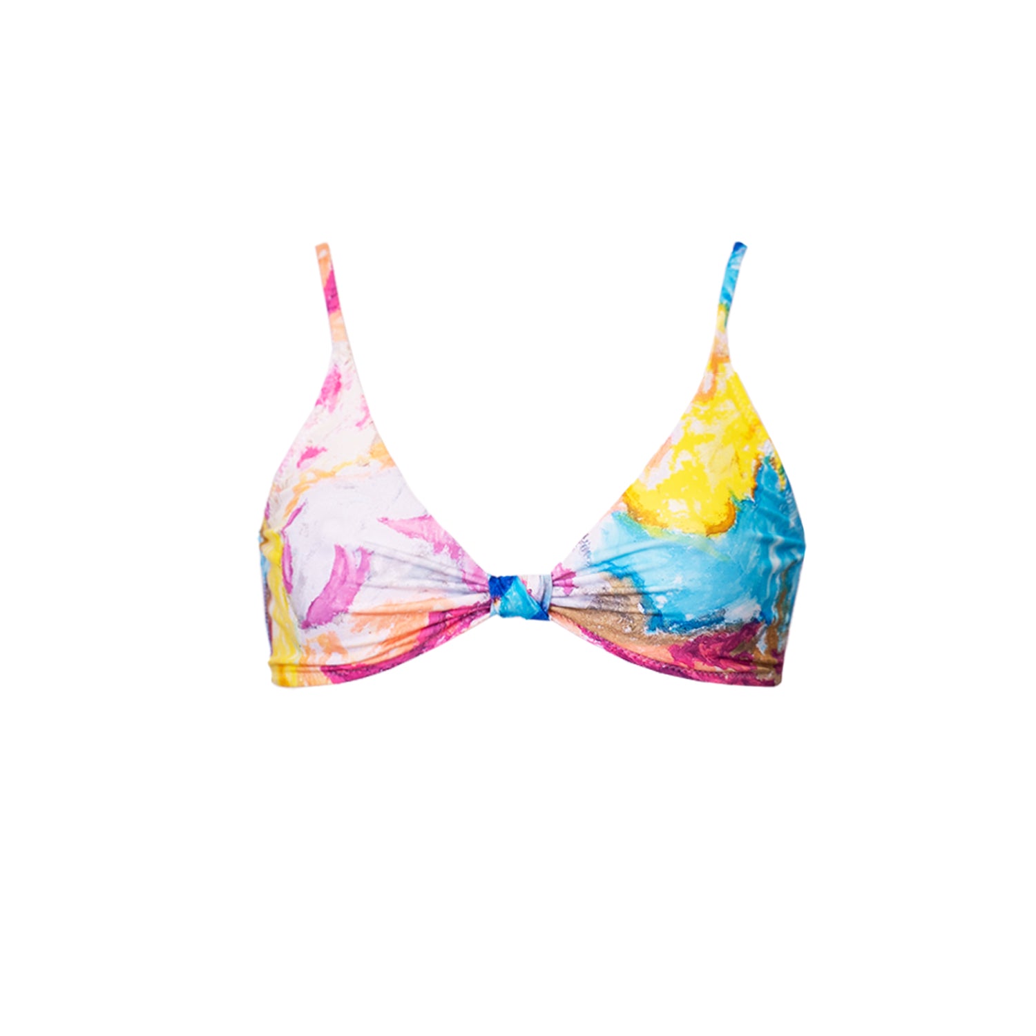 Craquez pour ce haut de maillot de bain à la coupe délicatement torsadé au centre. Il est orné d'un motif multicolore inspiré de l'aquarelle Helio de l'artiste fuchsia.