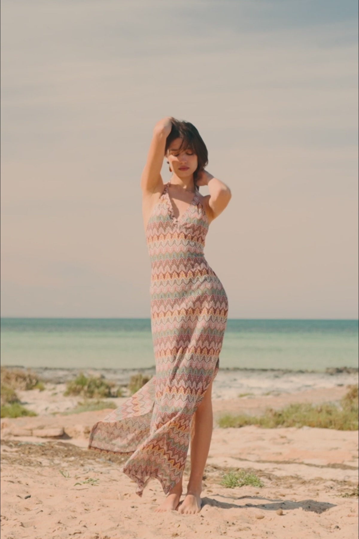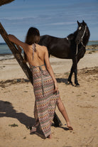 Enveloppez-vous dans la robe de plage « Rose Blush » et incarnez la beauté éphémère d'une floraison estivale. Cette pièce, issue de la collection « Nature's Symphony », évoque l'aube avec ses roses tendres et ses tons neutres discrets. Son tissu fluide, orné d'un motif zigzag complexe, capture la délicate symétrie de la flore alpine. Son dos nu offre une coupe confortable et flatteuse, tandis que le lien à nouer dans le dos souligne la taille avec une touche bohème chic, ce qui en fait la pièce idéale à superposer à tous les maillots de bain de la collection.